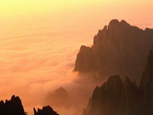 云海玉盤(pán)----泰山云霧可謂呼風(fēng)喚雨,變換無(wú)窮:時(shí)而山風(fēng)呼嘯,云霧彌漫,如墜混沌世界;俄頃黑云壓城,地底興雷,讓人魂魄震動(dòng),游人遇此,無(wú)須失望,因?yàn)槟銓⒁?jiàn)到云海玉盤(pán)的奇景:有時(shí)白云滾滾,如浪似雪;有時(shí)烏云翻騰,形同翻江倒海;有時(shí)白云一片,宛如千里棉絮;有時(shí)云朵填谷壑,又象連綿無(wú)垠的汪洋大海,而那座座峰巒恰似海中仙島。站在岱頂,俯瞰下界,可見(jiàn)片片白云與滾滾烏云而融為一體,匯成滔滔奔流的“大!保钊M生,又令人心朝起伏。
