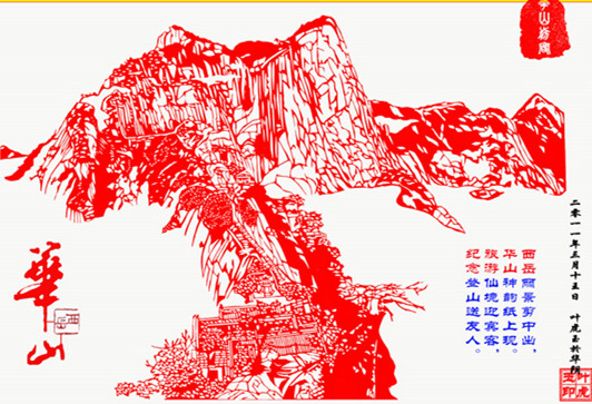 華山剪紙:剪紙是勞動(dòng)人民在生活中寄托情感,抒發(fā)胸臆的一種藝術(shù)形式,多見(jiàn)于窗欞、門(mén)簾、頂棚、炕圍等民間住宅,也用于陶瓷、刺繡、印染等藝術(shù)品,風(fēng)格明快簡(jiǎn)潔、手法夸張樸拙。華山剪紙因地域的不同而風(fēng)格各異,有的秀麗明凈,有的概括凝煉,有的柔健相濟(jì),有的粗獷古拙,表現(xiàn)出了豐富的藝術(shù)形象。